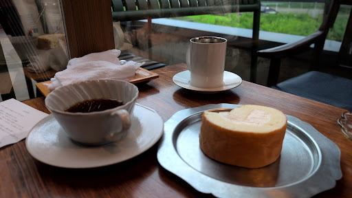 白壁の町吉井町からほど近い、耳納連山の麓にあります。離合不可能な細い道を約300mほど山に向かって走ると左手にお店はあります。駐車場はお店の前に約10台程度あります。この駐車場迄は道が細く、満車の場合は何度も繰り返してUターンしなければならないので、運転に自信が無い方は県道沿いに未舗装ですが広い駐車場があるので、そこを利用した方が賢明でしょう。駐車場は「ぶどうのたね」グループ店舗と共通です。 お店入口でスリッパに履き替えて店内に入ると、左には照明を落とした落ち着いた雰囲気のカウンターがあり、7人程度座れます。右手には大型の熱風式焙煎機があります。2階は明るい開放的な雰囲気のテーブル席で2人掛け席が2卓、4人掛け席が1卓あります。お冷はセルフサービスです。窓の外には広大なぶどう畑と吉井の街並みが広がります。メニューには5種程度のコーヒーの説明が書かれていますが、スタッフが味の好みを聞いて、メニューの中のコーヒーからセレクトしてくれます。プリンセット(¥1,300-)を頼みました。プリン単体の追加は¥550-との事。 またロールケーキも追加しました。プリンもロールケーキも甘さ控えめな大人の味です。ロールケーキはフワフワの食感が素晴らしく、プリンは濃厚。 珈琲はエチオピアにしました。酸味が奥深く、素晴らしいアロマが香ります。レジでは豆の販売もあります。香り見本があるのでお好きな香りで選ぶのも良いと思います。価格もとてもリーズナブルです。支払はカードも使えま...