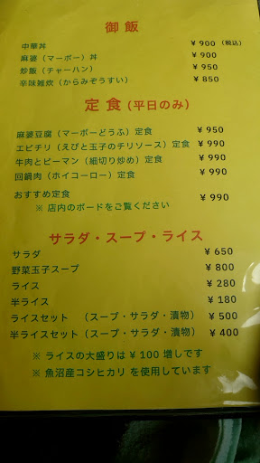 Read more魚沼の17号沿いの中華料理屋さん。意識して見ていないと中華料理屋とは気付かないで通りすぎてしまいます。混雑時は駐車場は大きい車だと駐車しにくいかもしれません。 店内は、テーブル席とお座敷席です。 人気の麻婆豆腐は、陳さんのお店で修行したとのこと。日本の甘い麻婆豆腐ではなく。辛さと痺れのビターな麻婆豆腐。辛さはほどほどなので、辛いのが苦手な人でも大丈夫です。...
