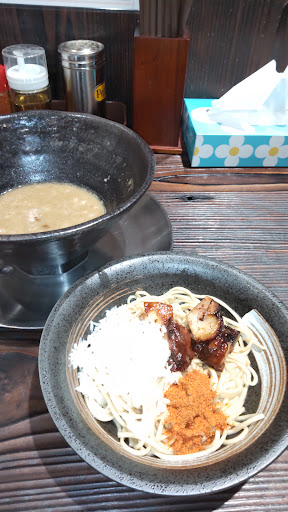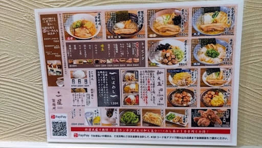 午後七時ごろ 夕飯に伺いました 限定濃厚煮干しそば900円大盛無料、チャーシューごはん300円、からあげ(むね)240円を食す。 店入り口の券売機にて、ペイペイ払いはどうするのか解らなかったので、店員さんに「ペイペイ払いはどうするのか?」と、聞いたら。席に着いて店員さんに注文をしてメニューの隅にあるペイペイコードのスキャン払いだそうです。 その辺の説明がどこにも書いてないようなので、不親切☆一減。 食べたラーメンは煮干しで濃厚?と思い注文、限定40食とありますが平日の夜の為か頼めました。食べてみて美味しかったです。大盛りにしたせいか、オシャレ系のラーメン丼ではスープが見えず、大食い男子にとってはチョット嬉しい、味も確かに濃厚、天一のスープのように魚粉で粉っぽい感じ。 チャシュー丼はチャーシューの味が濃く、ラーメンのチャーシューで十分なので頼まなくても良かった感、でも十分美味しかったですよ。 唐揚げ(むね)は、240円で2個、衣が薄くて、すり身揚げみたいな感じ、鶏肉はジューシーだったのてそれなり、まぁ一度食べたらもう良いかな。 食した後、メニュー見たら和え玉!?赤玉小150円を注文、とりあえずラーメンのスープに混ぜずに食す、チョット麺が硬いが、それなりに美味しい、赤玉とあるから ペーストみたいなものが掛かっているのかな?と思っていたら、カプサイシン系の粉でした。 トッピング無料券がもらえたので、次回は ラーメン→和え玉→にぼめし、で攻めたいと思います、多分この頼み方が大メシ食いの為のコストパフォーマ...