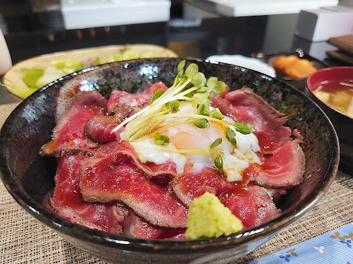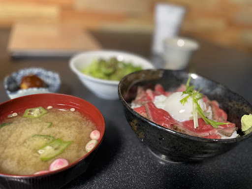 オクラの味噌汁はオクラが新鮮で歯応えがあります。卵焼きは味がしっかりついていて食べ応えがありました。お漬物は少しさっぱりで食べやすかったです。 ローストビーフ丼ですが、お肉の切り方は薄切りでとても良いと思いました。控えめながらも赤身の味はほのかにしましたが、決して強い赤身の味ではないです。そして、タレはとても美味いと思いました。150円増の定食で卵焼きも味噌汁も美味しかったです。
