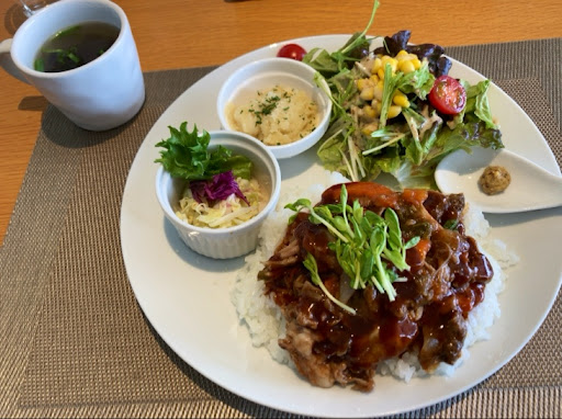 プルドポークは豚塊肉を野菜と煮込み、柔らかくホロホロになったら細かくほぐす料理。CafeRayさんではコレをご飯の上に乗せ特製ソースをかけて食べる1品に。お肉タップリなので食べ応え抜群だし、しっかり煮込まれてるので旨味溢れてご飯が進み美味しい。特製ソースも甘みとほんのり酸味がありお肉の美味しさを引き立ててくれる良い味わいだった。ちなみにプレートにはサラダ・ピクルス・マッシュポテトが添えられていて、手まり麩入った色鮮やかなスープ付です。