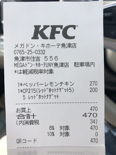 Read more土曜日に持ち帰りました。 チキン5ピースとポテトとレモレネード買いました。 店内が混んでいたので待ち時間にポテトとレモレネード頂こうかと思っていると、別々にお出しできませんからと、出してもらえませんでした。