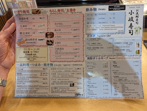 Read moreNice sushi place with and Japanese and English menu card. There is a small variety of different dishes available in this small and local sushi place. See the pictures for the menu. I had the chef's selection with a variety of 9 nigiri sushi and the grilled head of fish. For a total of less than ¥1500 I had a decent meal. I'm sure the more expensive dishes are just as tasty and the offer of fish is more exclusive. I was seated at the bar, where you can enjoy how the chef is...