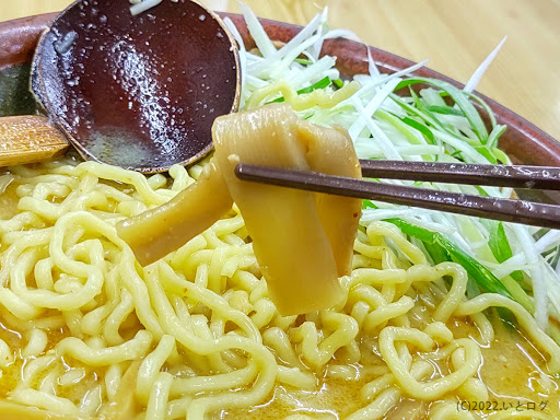 【麺】 アツアツの縮れた太麺はやや白色です。 啜れば少し粘り気のある食感。 そしてモッチモチ★ 優しくスープに絡む感じ。