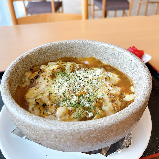 つぶ貝+卵の石焼カレーを注文、10分しないで料理が到着しました。熱々のカレーはからすぎず、チーズとの相性抜群です。 つぶ貝は歯応え良くこちらもとてもおいしかったです。