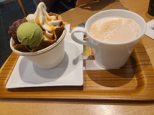 This green tea/ ice cream/ coffee shop is very nicely decorated inside the Parco City Mall. There are so many choices of dessert and drinks here. We ordered a waffle cone filled with one scoop of green tea ice cream, some soft ice cream and some mochi balls. The parfait set comes with a coffee and a parfait with sesame ice cream, soft ice cream, some corn flakes, and some kind of pudding at the bottom. Everything was so delicious! It's a very nice environment to have some dessert and chat with friends. Strongly recommend if you are tired from all the shopping and need a break to...