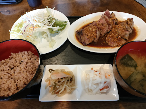今回注文したのは目玉のあぶりステーキ(1000円)。セットで玄米or白米、スープ、サラダ、漬物がつき、ご飯とスープはおかわり自由!フリードリンク(デトックスウォーター、ウーロン茶、アイスコーヒーなど)も付いて、この値段は本当にヤバいレベル。肉は外側をあぶったレア寄りの焼き加減で、ジューシー。ソースはにんにくと大根おろしの組み合わせが個性的で、ガーリックがガツンと効いて食欲をそそります。玄米のご飯も香ばしく、スープはとろみのある卵スープで温かく、全体のバランスがいい。サラダも新鮮で、漬物(モーウィっぽい?)がアクセントに。