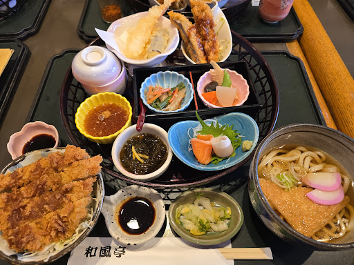 Read more沖縄地元最大手のスーパーマーケットチェーンのサンエー系列の和食ファミリーレストランです。和風亭の店舗は「◯◯シティ」、「◯◯タウン」、「◯◯プレイス」などの、サンエーを中核とするショッピングセンターの中にテナントとして入っているのが普通ですが、ここは独立した建物で、近くのサンエーV21うらにし食品館と、50〜60台は停められそうな広い駐車場を共有しています。屋根の上には、神社の本殿の千木を意識したような飾りがあります。フロアの面積は他の和風亭と比べて際立って広いわけではありません。