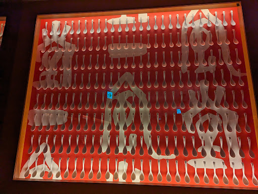 Restaurant: This is a really cool space. It features ramen bowls, spoons, and noodles on the wall. The tables/chairs are on the small side, but it's not noticeable. They give bins to hold your items underneath the chairs. The staff were all very friendly and understanding that we did not speak Japanese.