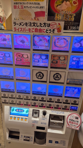 You order through a vending machine at the entrance and it gives you a ticket. There is no English, but we used a translate app and the staff, while having limited English, were really kind and helpful. The atmosphere was clean and cool, with hanging chicken toys adding a fun touch. Definitely worth a visit if you're after tasty ramen and a bit...