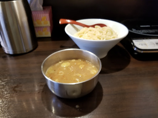 ただIHを使えるようにする為なのか、つけ汁の器がステンレスで安っぽく見えてしまうのはもったいない気が(人気店のようなので) またIHで再加熱した時に加熱加減によっては熱くて持ちづらくなる時もあるので注意してください IHはカウンターの2席で1つ設置されており、卓上調味料などの関係か真ん中でなく、どちらかに寄って置いてあるので気が小さい人はやや辛いかも?