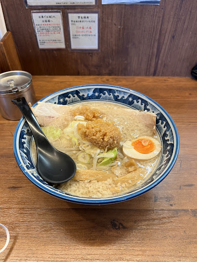 Read more背脂ニンニクラーメン(多分こんな名前でした💧すいません)いただきました。 早めのお昼を食べにおじゃましました。店内はテーブル席とカウンター席と充実。広めの厨房を囲むようにレイアウトされてます。食券を買って店員さんへ。すると『野菜の量は?』と聞かれたので、二郎系?もちろん『少なめで』と即答。なるほど、そっち系ですか。続けざまに『ライスは?』。もちろん辞退です。朝の時間帯はライス無料サービスとの事。素敵なサービスですね。やり取りの後トイレへ。ラーメン屋さんでトイレは借りないのですが…今回はお借りしました。よくトイレが残念とのカキコミを拝見しますが、こちらは快適空間ですね。最新の便器、ペーパータオルもあります。加えて口臭予防のうがい薬(モンダミОみたいなやつ)も配備。おもてなしが素晴らしいです。トイレから戻ると直ぐに着丼です。まずは見た目。長いチャーシュー、そして背脂。この量は過去トップレベルかも。中心にある物体は刻みニンニク?一口。これはご飯にも合う逸品。そしてスープ。予想通りの豚骨ベース。かなり塩味が強め。ライスありきの塩味かなぁ。この塩味は好みが分かれますかね。麺は中太のストレート。食感もありスープのインパクトにも負けてないですね。麺を食べてスープを楽しんでると、刻みニンニクがいい演出をしてくれますね。しかし、塩分過多にリミッター発動💧お店に申し訳ないですが、半分程でお残しさせていただきました。 塩分濃いめなのですが、野菜を普通通りにオーダーすればちょうど良かったのかな?と、思いつ...