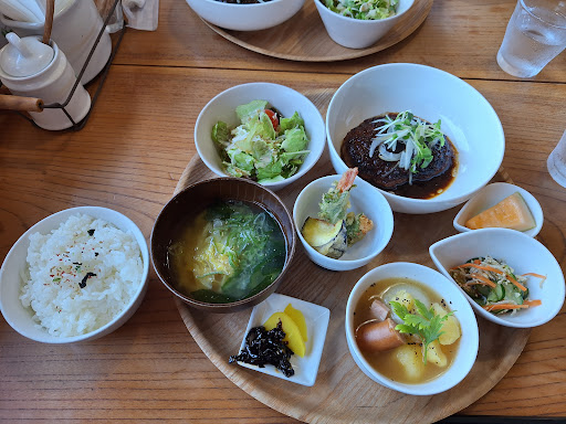 日曜日の12時に来店。先客は2名。ランチメニューのハンバーグを注文しました。 そのあと、次々とお客さんが来店し、あっという間に満席に。 接客を1人でされており、お水や注文取りが滞っていました。 私たちはタイミングよく早めに注文できたので、15分ほどで提供されました。 お味噌汁、ポトフ、ハンバーグ、サラダ、お漬け物、メロン、和え物、海老とナスの天ぷらと品数が豊富で、白飯も「普通でいいですか?」と聞かれ普通盛りをお願いしましたが、たぶん 大盛りとかもできるのでしょうね。すごいサービスでした。これで、税込み1.350円!安すぎます…😱 フロアを1人で対応されてるので、注文を待たれてる方もいました。。 ...