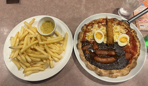 「ゴリえもんカレーピザ」 直径24㎝のゴリえもん?というブッサイクなキャラをモチーフにしたピザ🍕。コーンやトマト、エビフライにソーセージ、ゆで卵などのトッピングが乗っています。ゴーゴーカレー監修とあって、カレーはスパイスが程よく効いていて美味しかったものの、ピザ生地が薄くパサっとしていた印象です。