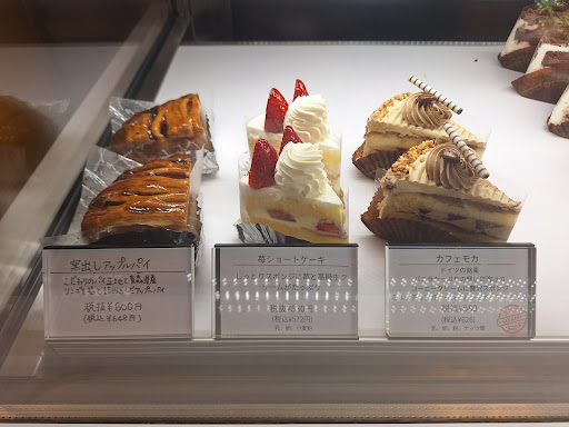 こんな洒落た店がこんな道端に、こんな田舎にあるとは! 父の日のお祝いに甘味でも久しぶり買うかとちょっと近場に来た時に検索して訪問しました。 こじんまりとした店ですがショーケースの中には写真のような手の込んだケーキがズラリ。 思わず目を奪われました。 しかも週替わりで新しいケーキを入れ替えすると言う気合いと根性が入ったスタイルらしい。 甘いものだけでなく惣菜パンもあります。 キッシュとカヌレと何とかというパン買いましたがこれらも味が濃厚で美味しかった。 バラの花を模したものはチョコレート味。みどりのはピスタチオケーキで複雑な味わいでした。 あまり甘いものは普段食べませんがまた行きたい、ショーケースをまた見てみたいと思わせるお店でした。 追記 ショートケーキ、チョコレートケーキ、モンブラン、噂のシュークリームを買ってみました。 オーソドックスなケーキも美味しい。特にモンブランが固い層、サクサクの層、柔らかな層と三層仕立てになっており面白かった。 美味いと噂のシュークリームは見た目通りザクッとした表面にまとわりつくぐらいねっとりしたクリームが濃厚で満腹中枢が強く刺激される。 たまの食事はこれだけでいいかもしれない。 何かのお祝いに喜ばれる品々でした。