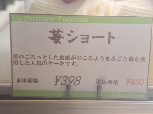 R6.12 シャトー·ドゥ·シャンボール 牛久シャトー 見た目違うが シャトーということで… 帰省土産のワインケーキ買いに プチガトーも て 抹茶のオペラあるやん なんかオランジェットやないオランジェッタとか ロールケーキか思たらショートケーキらしいし 普通のシュークリームないし なんか面白い 基本のショートケーキ チョコ好きにてチョコの丸いのん オランジェットやなくてタ イミフな栗シュー 逃せないオペラ 買う 店内写真あかんてパティシエに断られた ワインケーキのほかにも 色々焼菓子もあったんやけどな ケーキのネームプレートだけ コソっとパシャ 苺ショート ロールケーキっぽい クリーム 甘さ少ない ジェノワーズ フワフワ軽 真ん中にもジェノワーズ これシロ·ドゥ·フレーズで強めにアンビベ いい が 主張しない コクあるショート な感じ プラリネ·ショコラ チョコのアンロバージュ 光沢ないからグラサージュやない でも カカオニブまぶしてあって期待高 が 中のプラリネ軽 なんか普通のクリームぽい クリーム多めでプラリネ感あんまない クレーム·オ·ショコラも軽 チョコ感ほんのり アンロベのチョコ味メイン クリームちょと香り カカオニブ食感と風味出す みたいな組合せ 食べ易過 濃いのがいい オランジェッタ オランジェットのケーキバージョン なんか てっぺん潰れてるんやけど… オレンジピールやなくてコンフィうま グラサージュ光沢ないからアンロバージュ クーシュ上の方クレーム·オ·ブールやけど軽め クリームの真ん中 ユルいマーマレード粉砕したみたいなコンフィ 酸っぱくオレンジピール感高 クリームとのバランスいい このコンフィ どうやって入れたんやろ その下シャンティイ ジェノワーズ 薄いチョコ バスのジェノワーズ なんでジェノワーズ2階建てなんやろ 全部でオランジェット感ある フワフワ食べるの楽し モンブラン·シュー 栗クリームとシャンティイ詰めてる由 パータシュー サクサクでイイ 甘み欲し で クリーム ほぼ栗クリーム シャンティイちょっと あーやっぱシュー·ア·ラ·クレームやない モンブラン好きには受けるやろけど 抹茶のオペラ いい 食べる前から大好き クーシュは下から ビスキュイジョコンド·オ·抹茶 クレームシャンティイ·オ·抹茶 ビスキュイジョコンド·オ·抹茶 茶色いクリーム薄く クレームシャンティイ·オ·抹茶 ビスキュイジョコンド·オ·抹茶 ガナッシュ·オ·ショコラブラン·オ·抹茶 透明ジュレでナパージュ 金粉 多分やけど クレーム·オ·ブール使こてない シャンティイ抹茶混ぜ いい で しっかり抹茶ガナッシュ いい ビスキュイも抹茶ちゃんとアンビベしっとり いい 中段のビスキュイに塗ってる茶色いのん謎 小豆か思たら甘ない 抹茶の苦味ある 砂糖抜きこし餡か いい フォークで切ろうとすると シャンティイぶしゅーてなるけど いい 苦味も甘みも少ないけど いい 基本路線ドンピシャ できたらガナッシュもう1層足して トップに抹茶の板チョコ載せて ほんで大人の味にしてほし パティシエ アイデアとかイイと思う やけど 地元のケーキ屋やね 食べやすくしてる 価格も抑えてる...