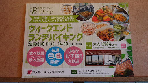 Read more妻と二人で「ランチ・バイキング」に伺いました。 お値段は1,980円/人で、ホテルの食堂でのバイキングとしてはリーズナブルと思います。 料理は『和洋折衷』で、特に変わった物などは無いオーソドックスなメニューだと感じました。 塩加減などの味付けは全体的に「程ほど」で、こういったバイキングにありがちの『濃い味』ではなく好感が持てました。 ただ、デザート系は『イマイチ』だったようで(私は食べませんので妻の意見です)、女性をターゲットにするなら『要・努力』のようでした。 しかしながら、ホテル最上階からの眺めは良くて、瀬戸大橋を一望出来るほか、JR宇多津駅に隣接しているのでJR四国の様々な列車の往来を楽しむことも出来ます。 ラフな服装でも伺いやすい雰囲気で、日常の生活に『ちょっとだけ贅沢を』な感じで利用する...