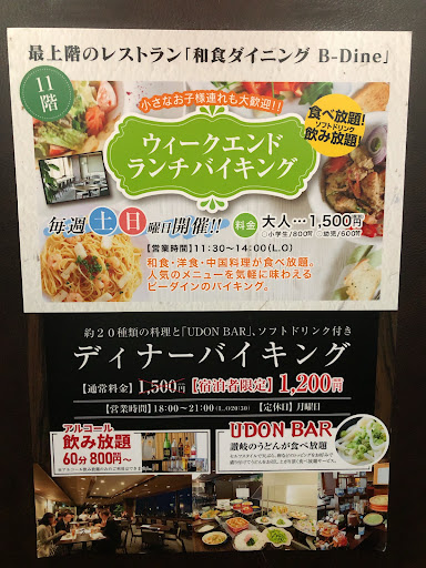 Read moreランチバイキングについて。全然補充されません。おすすめメニューの看板がホテルの一階に掲示されていましたが一口でおかわりできません。食べ放題なのに食べ放題できないです。デザートの種類も高校生の文化祭みたいな内容。マルータに載っている写真は誇大された写真です。刺身なし。天ぷらは野菜ばかり。今日だけなのか毎回なのかわかりませんが二度といきません。ドリンクも飲み放題ですがオレンジジュースも、ホットコーヒーも全然補充されず。烏龍茶とコーラ(ペプシ)カルピスはペットボトルのまま置かれています。値段...