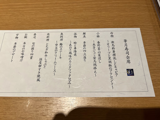 【冷 物】山芋とトマトの擦り流し~蓴菜といくら添え~ 【蒸 物】とろろ昆布冷製茶碗蒸し~南高梅のジュレと共に~ 【温 物】三元豚~夏野菜のさっぱり檸檬蒸し~ 【焼 物】葱鮪串焼き~ポルチーニクリーム掛け~ 【揚 物】冬瓜と皮付海老~香味野菜と田楽味噌の揚げ出し~ 【寿 司】旬の四貫 まぐろとろ カンパチ アオリイカ サーモン