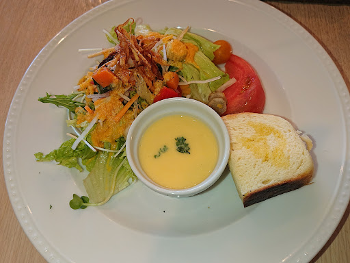 Read moreおもてなしを感じられるお店です。店員がお出迎えしてくれる。メニュー・料理案内あり。店内は開放感あり小洒落た感じ。調理風景見れワインやオリーブオイルなどが並ぶ。4×4テーブルが9席、対面カウンター10席、半個室もあります。ランチは税込1350円、前菜は野菜・フォカッチャ・スープ、メインはパスタ(数種から選べる)、ドルチェ、ドリンク(選べる)。料金プラスで色々アレンジできる。パスタ数種あるがメインはトマトソースパスタかペペロンチーノでその他パスタにしている所に正統派のお店だと思いました。ペペロンチーノはニンニクスライスのほかカリカリの豚肉・トマト・大葉など入りオリーブオイルをかけており創作パスタのようで美味。カボチャのケーキ・水出しコーヒーも美味しかったです。前菜は悪くないが常温提供でビシソワーズスープ・サラダはもう少し冷えてればフォカッチャももう少し温かければと感じました。席数多くランチもかなり良心的な値段でやっているので、総評としてはコスパ...