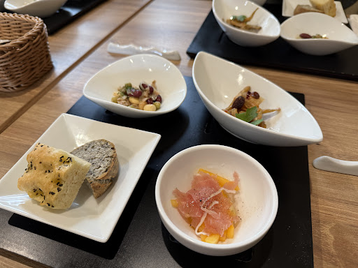 前菜はやしお鱒のしっとり感、サラミの下の紫キャベツの味付けが印象的で大変美味しく、パスタはトマトソースの味のバランスが絶妙で油分も多過ぎず大変好みでした。メインのお魚料理も桜鯛がしっとりふっくら仕上がっていて素材の味を堪能させて頂きました。 デザートのチーズ?ケーキだけは特徴もコクもなくあら?っと思いました。