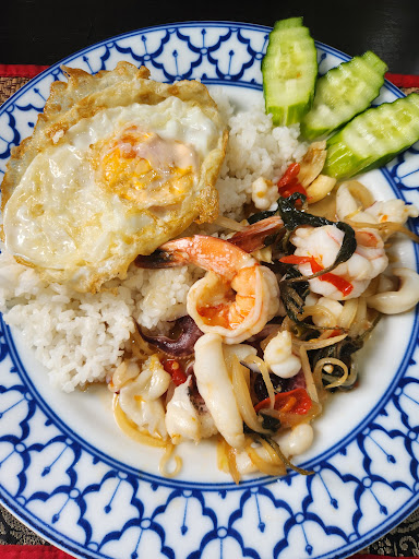 ずっと気になっていて、やっと伺うことができました。道路沿いにタイの旗が出てるので見落とすことなく入店できるかと思います~! たくさんのメニューの中から、 パッガパオタレー(シーフード炒め)・グリーンカレー・トムヤムクン・プラームクバッポンカリー(いかの卵カレー炒め)を注文しました! 初めてのパッガパオタレーは辛めの味付けで、エビやタコがごろごろ入っていてシーフード好きにはたまらない一品。ご飯ともよく合う~ 添えられているキュウリもギザギザカットで地味にうれしい~!グリーンカレーやトムヤムクンなどの定番は、他店と味比べしながら食べる楽しさもあり。すべて美味しかったです! また食べに行...