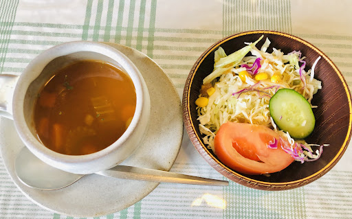 先にサラダとスープが運ばれてきました。カットトマトときゅうり、細切りミックスキャベツにコーン!玉ねぎ系?のドレッシングがおいしかったです。