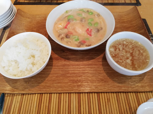 Read more平日12時少し前に初めて訪問。ちょうど2人がけの席が一つあり待たずに着席できました。 ランチはプレートランチとご飯・麺ランチの2種類。プレートランチは海鮮か肉料理にスープ、ご飯かお粥のセット。ご飯・麺ランチはチャーハンや担々麺、エビ入りワンタン麺など7種類。どれも美味しそうです。プレートランチは日替わりで今日は海鮮がエビチリ、お肉は唐揚げとの事。麺を食べるつもりだったのですがエビ大好きな私はプレートランチのエビチリ、連れは唐揚げを。そして食べたかった麻婆豆腐も単品で注文。すると、先に前菜のビュッフェがあり1人1皿でどうぞと言われて取りに行くとサラダや春雨、冬瓜の煮物、大学芋などが並んでいて、どれも美味しく待ち時間もあっという間。 まず麻婆豆腐。山椒がたっぷりかかっているけどシビ辛ではなく程良い辛さ。エビチリは久しぶり。しかもエビが大きくて満足感一杯♪食後には杏仁豆腐とマンゴープリンまで出てきて、これまた美味しく大満足のランチでした! お会計の際、レジ前に前菜で食べた大学芋が売られていたので迷わず購入。 次回はご飯、麺...