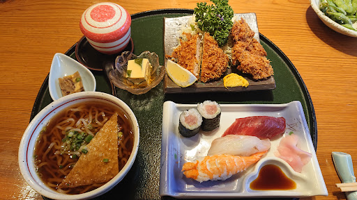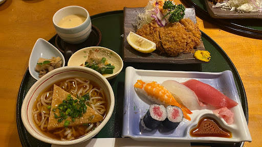 早速シェアして頂きます。 ・寿司ヒレカツ膳1,760円(税抜) ヒレカツ、握り寿司、うどん、茶碗蒸し、小鉢2品の御膳内容となります。 ヒレカツは程良い軟らかさで油切れが良くサクサクとした口当たりですね。 握り寿司はマグロ、鯛、海老、鉄火巻きですが魚の味わいが薄く少々残念。 キツネうどんはお揚げの甘味がスープ全体に広がりスッキリとしないです。 少々温めの茶碗蒸しは喉越しは良いが少ない具材で銀杏が入って無く残念。