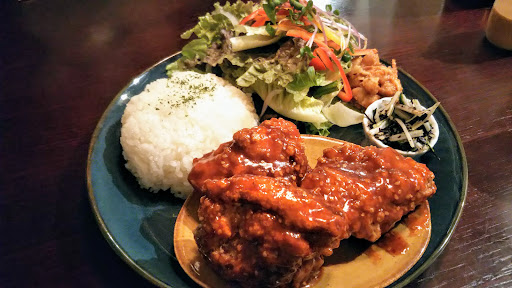 ・ヤンニョムチキンのディナードリンクセット1,580円(税込) 大きくボリュームの有るヤンニョムチキン、ライス、サラダ等のプレート内容。 甘辛のチキンは外がカリカリで中身は軟らかく癖になる辛さで美味しいですね!