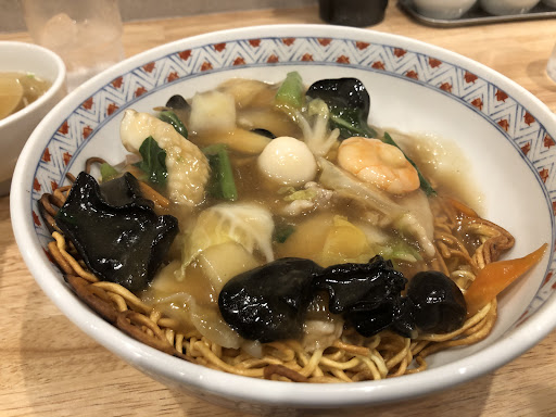 友人に薦められ、初めての来店店内は祝日の夜ではありますが、ほぼ満席状態、妻は来る前からサンラータンメン、餃子。私は来店して、他のお客さんにあんかけ焼きそばが運ばれて来たのを見て、みちのく焼きそば大盛りと餃子ご飯セット。焼そばの餡の具材はイカ、エビ、うずらの卵、キクラゲ、豚肉、白菜、そして私的には小松菜が入って完璧な布陣です。麺は揚げられたかた焼き部分と柔らかい部分とが2:8ぐらいの割合でこれも好みで美味しくいただきました。餃子も好みのタイプで満足しました。
