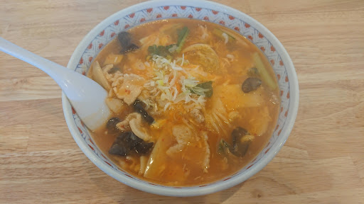 スープは、餡のとろみで熱々で火傷寸前です。猫舌は食べるのに時間掛かりそうです。酸味がちょっと強めな感じです。 細麺が熱々のスープを運んでくれますが気を抜くと熱さと酸味でむせそうです。細麺なので時間経つとのびるのも早そうです。