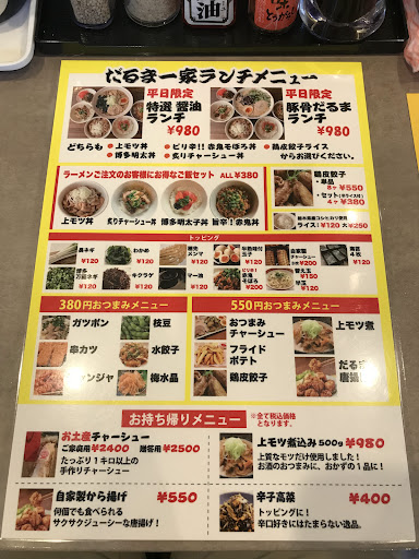 次回は今回注文できなかった鬼だるまらーめんをリベンジしたいと思います。 サイドメニューではモツ丼や明太丼なども気になりますが価格がちょっと高めの設定(580円) ラーメン注文の場合のみプラス380円でミニ丼も注文できるみたいなのであわせてトライしてみたいと思います...