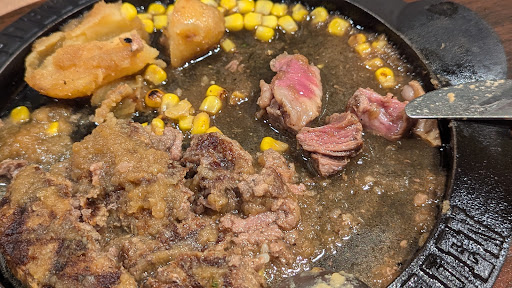 鉄板が温い そりゃ肉も最後までレアで火が入らないし、ガーリックライスもなかなかバターが溶けなくべちゃべちゃしてて、作り置きのお弁当みたいに熱冷ましでもした感じ