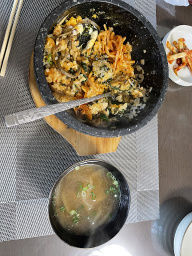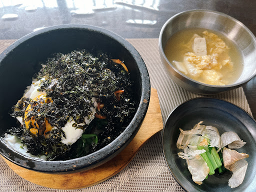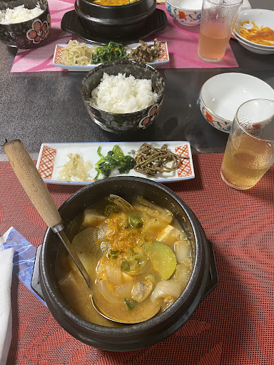 Read more自宅を改装した店舗です。階段下のインターホンを押すとお店の方が出てきます。玄関の自動ドアはお店の方が操作してました。駐車場は自宅下に3〜4台(車高制限あります)、少し離れた所に砂利の駐車場が4〜5台分あります(韓国料理と書いてある赤いのぼりが目印です)。1人でも入店出来ますが、グループ向きの雰囲気です。4人掛け3卓、お座敷2人掛けと4人掛けありますが、何卓あるのかわかりませんでした。 ランチメニューは6種類。全てドリンク付きで税込1100円。その他、定食・単品・宴会コースがあります。 今回は『石焼きビビンバ』を注文。 最初にお通しが出てきます。ほうれん草のお浸しでしたが、茹で加減が丁度良く茎のシャキシャキ感が最高です。 ビビンバはパチパチといい音を立てて運ばれてきます。中身が見えない程の刻み韓国のりと半熟目玉焼きがのっています。混ぜると具が沢山出てきて、2人前はありそうなボリュームです。混ぜるときに器がクルクル回ってしまい混ぜにくいです。ビビンバのタレが辛めなので、辛いのが食べれない方はお控え下さい。 スープは溶き卵と木綿豆腐で優しい味付けです。干物のような?魚が入っているのですが骨が多かったです。出汁に使っているのでしょうか…。魚の臭みはないです。 ドリンクはコーヒー(ホット・アイス)、コーラから選べます。 調理されてる奥様は韓国の方なので、本格的な韓国料理を美味しく頂きました。単品メニューの種類が少ないのが残念です。