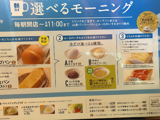 Read moreモーニングに行きました。 モーニングは、飲み物を頼むと11時までは、パンが付きます。 コメダの豆菓子は、モーニングではつきません。