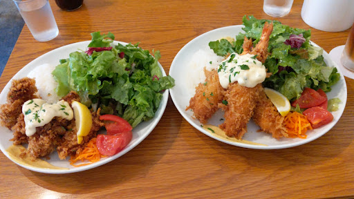 Read moreランチはライス、パスタ、サンドイッチの3種7品程で、ワンプレートスタイルで提供しているよう。大皿にサラダとメイン料理が添えられている。注文したのは"海老フライ"、追加で"木の子のポタージュ"と"珈琲"を。一見皿が大きいのでボリューミーに感じるが、約半分はサニーレタスのサラダが占めているので、量的には丁度良い感じ。海老フライ3尾はプリプリサクサクでとても美味しい。ポタージュも美味しかったし、量、味わい、コスパの三位揃っていると言えそう。大変な人気店のようで、平日の営業開始過ぎに訪れたが、何とか一層目で着席することができた。着膳までの所要時間は約30分弱。時間的余裕ある時の利用に限られそうだが、雰囲気がとても良くて女性受けするモダンなカフェ風、そして男性でも満足できるボリュームと、雰囲気で訪れても良し、味やボリュームで訪れても良しと、様々なシチュエーション...