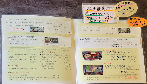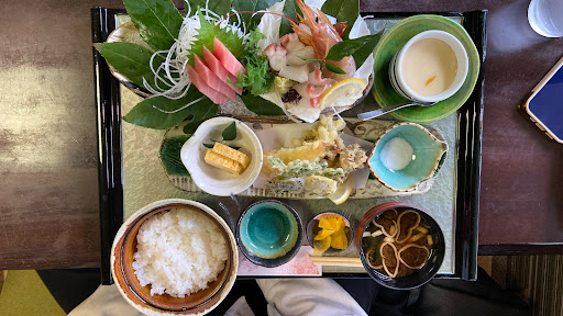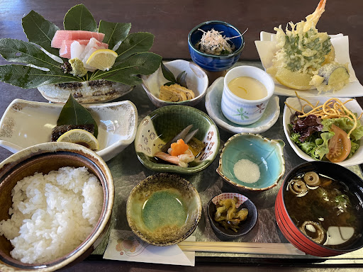 Read more駐車場は店舗前に5台と店舗後ろにもあります。 ランチタイムのみ「7歳以下のお子様お断り」となっていますのでご注意下さい。 店内はテーブル6人掛け1卓、お座敷5卓で、お座敷は襖で仕切られて個室になっています。ジャズが流れているので落ち着いた雰囲気の中で食事が出来ます。 ランチメニューは6種類です。 今回は、色々な物が食べられるランチ限定楽しみ膳(刺し身・天ぷら・焼き物・茶碗蒸し・小鉢・サラダ・お新香・みそ汁)税込1350円を注文。