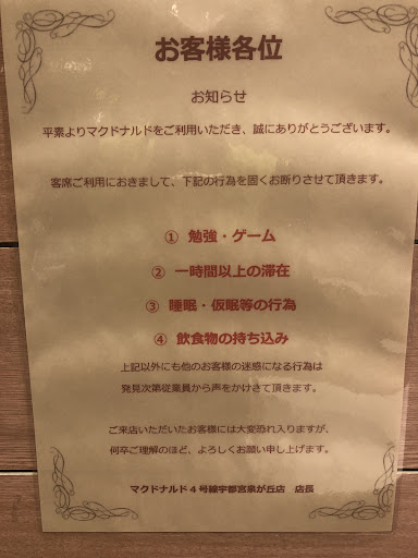 It’s unfortunate that I can’t do my work while eating there, lots of spaces for seating unlike Starbucks (and Macdonald branches in Tokyo) which lets customers seat for long periods, I gladly bought more coffee to show my appreciation to Starbucks. I recommend taking out instead or use the drive through service for this Mac. (Can’t really blame them when there are also other...