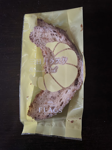 まず出会いは人気のあるケーキ屋さんというフレーズからでした 聞いた事があるようなないような名前FLAGSとにかくNAVIにお願いして現地入りしました 広めの駐車場は好印象半分近く埋まってました おっ人気店なんだ!コリャ買うのもひと苦労かなと思いつつ この外見にえっ?化け物屋敷?と疑いながらも入店しました まー時期が時期だけにハロウィンってるのかしら 店内はケーキ お持たせ用 焼き菓子とエリアに分かれて店員さんも数多く順繰りに注文取りしていましたふたりほど待ちいよいよじぶんの番にショーケースを覗くと こんにちは!どう美味しそうでしょ?買って買ってと彩り鮮やかなケーキ達が誘います ぐるっと見て連れ帰る季節の果物がのってるのを何個か選びケーキといったら外せないイチゴがのったショートケーキをひとつ頼んでさっき選んだ焼き菓子と合わせて会計です 持ち帰りの時間を言い会員カードの説明を受けて店内を後に車に戻ると店からの遠い場所は従業員用の駐車場なんだ 実質半分は店の駐車スペースなんだなぁって感じ 混んでる=人気はないのか まぁ後は味だなと店を後にしました 夕飯のデザートとしていちぢくタルトを選びます小ぶりでタルトの上に実の半分くらいの輪切り 生クリームがのってるタルトが解りやすいですか?奇を衒ってる訳でなく いちぢくの味を活かしてる訳でなく タルトを食べました 不味くは無いですけど一番気になって購入したのでちょっとガッカリしましたけどもう少し食感に変化があるさ専門店扱い出来るのですがもうケーキ屋さんなんですよね 焼き菓子は普通に紅茶に合いました パッと見華やかで楽しいけれど食するとケーキ屋さん止まりの様でしたので普通の星の数 今回接客して頂いた店員さんの点数高いですけど ホールケーキへのこだわりは奇を衒ってる様です