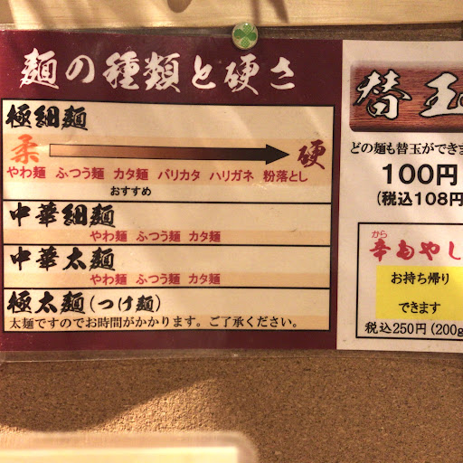 ーーー 2019年 → 『宇都宮とんこつ』がメインだが、塩・醤油・味噌・麻婆ラーメン・つけ麺など、ひと通り揃っている。サイドメニューも豊富。 無料トッピング(辛もやし、高菜、紅生姜、にんにく)もある。 また、麺も4種の中から選べるので、自身の好みに合わせてカスタムできるのが嬉しい。 子ども用の食器やイス、ブランケット、うちわ、新聞、Wi-Fiも完備されている。さらに、会計時には次回から使える替玉or味玉サービス券がもらえる。 色々とありがたい店である。