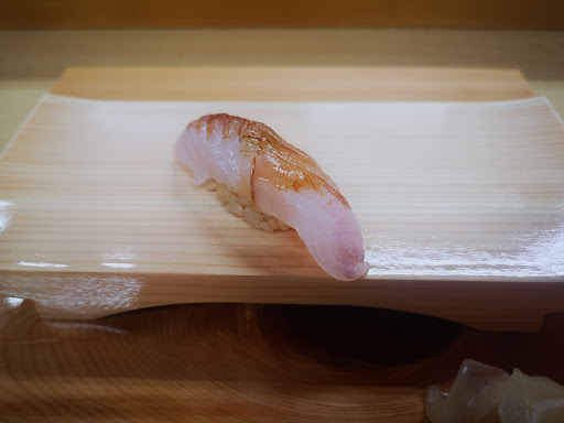 尚、知らなかったネタも二つ。ツムブリ、 ツバメウオ。 ツムブリは細長いブリみたいな感じで、味も すっきりしたアジとブリの中間みたいな美味。 ツバメウオは熱帯魚みたいな見た目で 臭みがあることもあり、扱いが難しいらしい。 でもちょっと暗い色調の白身は全く臭みなく ネットリした味わい。どの魚とも似てない。