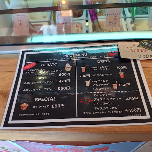 Read more3度お邪魔しましたがお客さんがひっきりなし来店してました。 いちごのジェラート、けずりいちご、いちごスムージーを購入しましたがいずれも冷凍臭がひどく美味しいと思えませんでした。 毎回お客さんはひっきりなしにスムージーやジェラートを購入していたので私が3回連続してハズレを引いたのかもしれませんがどれも味より冷凍臭が酷くてびっくりしました。 いちごけずりはどこのお店も冷凍臭がすることが多いのでまあ良いかと思ってますがジェラートとスムージーが冷凍臭するのは初めて...