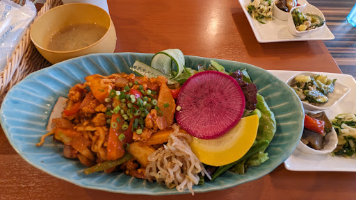 Read more子連れでも子供が退屈しないよう、沢山のおもちゃと遊具がありました! これならママもゆっくり出来る😭 メニューも、無農薬野菜をふんだんに使ったものや、サクサクジューシーな唐揚げ、無添加で手作りのキッズプレートなど、身体に優しいメニューがありました。 その日はお店一押しのベジ丼を🥗 出て来てビックリ‼️ 大きなボウルに新鮮な野菜がモリモリ! ドレッシングも3種類付いて来て、どれも手作りなんだとか。 前菜、ベジ丼、お味噌汁とセットで、どれも野菜がたくさん使われていました。 お腹がはち切れそうになりましたが、罪悪感はなく、身体に良いものを頂いたと思いました❤️ デザートもオーナー様こだわりの米粉のガトーショコラ、パンナコッタなどがあり、パンナコッタを…。 すごく優しい甘さでくどくなく、添えられた黒蜜がまたいいお味❤️ これはリピ決定です❣️ お店の方もとても気さくで居心地が良く、コロナ対策もかなり徹底されているので安心です! テイクアウトも何度か利用させていただきました! 美味しいお...