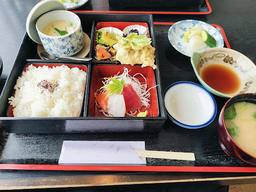 Read more松花堂弁当¥950をいただきました。 夫婦お二人でやられてるお店ですね。 お昼はけっこう早めに閉めてしまう印象でした。 刺し身3点、ひじきと筍、高野豆腐、小松菜酢味噌がけ、天ぷらは野菜3点、茶碗蒸し、漬物、ゆかりご飯、味噌汁 煮物や茶碗蒸し等も全て手作り、刺身ツマもちゃんと手切り、味噌汁も具沢山 とても美味しかったです。 きっちり仕事しているって感じでした😏...