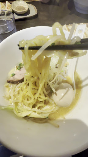 中に入ると、感じのいいおじいちゃんが説明をしてくれました。かなりしっかりと説明してくれました。 入り口の券売機でチケット購入後、席へ誘導してくれました。 おすすめもちゃんと書いてくれていて、お客さんに優しい感じです。 札幌の名店で修行されたらしく、味噌が一番おすすめということで、みそたまを注文。餃子もついでに購入しました。 友人はみそたま大盛り、バジルでグリーン味噌をそれぞれ注文。