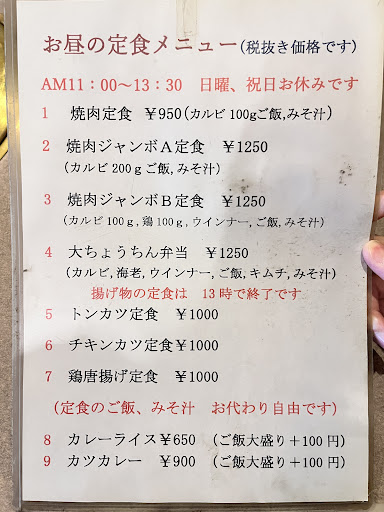 Read moreなんとなく入りにくい雰囲気を感じていて入店したのは初めてです。今回はA焼肉ジャンボ定食を食べました。量も十分あり美味しかった。水が甘くておいしい…どこかで汲んできてるのかな。あと味噌汁が美味しかったのでお代わりしたかったが、70代くらいの白衣を着た大将らしき人が、忙しさでいっぱいいっぱいな感じでだったので頼めなかった。あとランチ以外のメニューも見たところ割高な感じはなく利用したいと思った。メニュー以外にも、カレー煮込み用の角切り牛肉kg売りがあったりします。とにかくランチは割...