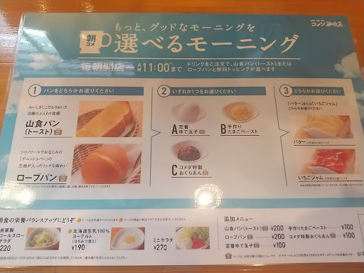 いつも1人の時はモーニングで利用させて頂いてます。 銀行や郵便局、スーパーでの買い物の用事がある日に開店するまでの時間を潰しています。 朝ということもあり、店内は学生や小さな子供もおらず、ご年配の方が殆どで、とても静かで落ち着いているので、その点は気に入っています。静かな朝の時間を過ごすのには良いお店だと思います。 駐車場も広いし、交通の便の良い場所というのもポイント高いです。 モーニングは、ドリンクの料金でパン(トースト)やゆで玉子等がサービスで付けれます!