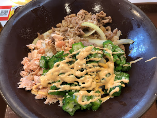 Read more盆休み期間は街の食堂などが休みだったのでファストフード店にランチに向かいました。 激混みで駐車場も辛うじて1台分の空き、ドライブスルーでは車が溢れていました やはり店内も人が沢山で片付けが追いついてません。 ここでややこしい定食系は時間が掛かると判断。速やかに出るであろうお勧めにあった牛丼に鮭オクラのトッピングを注文。 けど完全に期待を裏切られました。 やっぱり遅い。ドライブスルーやネットオーダーを優先にしているのか? おそらく10分程度かかって提供されました。 時間の掛かった牛丼は...