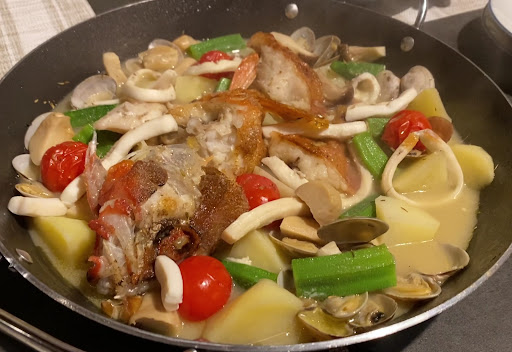 The menu I had features appetizers, a salad with local Yushi tofu and fresh vegetables, followed by roast beef and main courses of homemade basil and garlic spaghetti and acqua pazza with locally caught red grouper. The meal ends with a delightful sherbet.